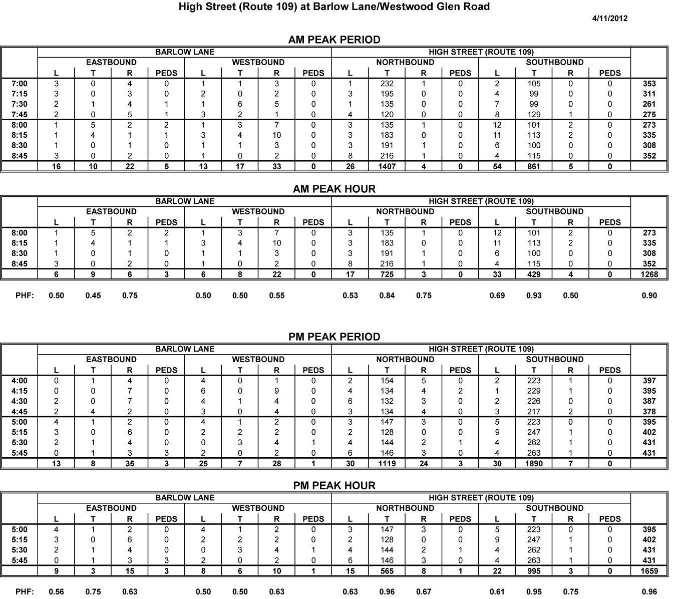 The information for the Westwood corridor and intersection was extracted from the FDR “High Street (Route 109) Improvements, Gay Street to Summer Street,” completed in July of 1996 by Greenman-Pederson Inc.