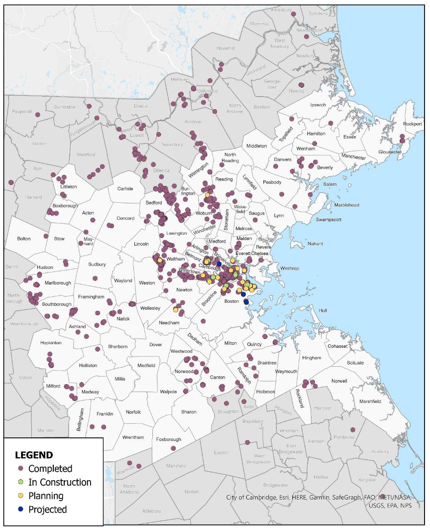 Additionally, we spoke with JLL, which manages many properties in the Boston region, including much of Greatland’s portfolio. Regarding TDM, the representative we spoke with remarked that the strategies that tend to have larger impacts are financial subsidies. It is important that there is a process in place to monitor TDM strategies such as shuttle service or subsidies to assess whether these plans are working. Cambridge has a robust TDM monitoring process, which is being used as a model for Somerville’s efforts to collect data about their TDM strategies. None of the other municipalities we talked to have reporting or monitoring requirements that are being enforced.