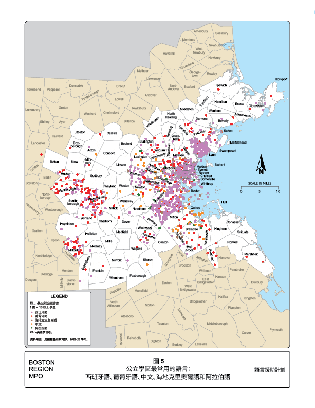 因為波士頓地區使用的「安全港」語言非常之多,在需求有限的情況下提供如此多的譯文會產生不必要的費用,MPO 不會將全部重要文件翻譯為各種語言。相反,MPO 會預留充足的資金用於將重要文件翻譯為 LEP 人士使用最廣泛的五種語言,使用這些語言的人在 LEP 人口中佔比超過 80%: