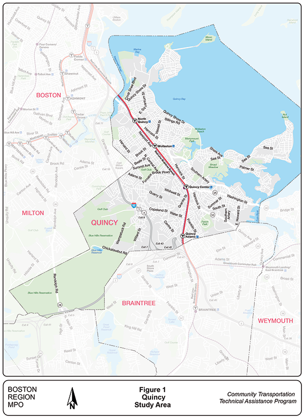The City of Quincy is an urban municipality and the largest by population, 101,636 as of the 2020 decennial census, in Norfolk County. It shares a border with Boston to its north, Milton to its west, Randolph and Braintree to its south, and Weymouth to its southeast. Its location within the MPO region is illustrated in Figure 1 on the next page.